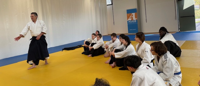 Après un premier volet sur la Prévention/Gestion des conflits par les principes de l'aikido samedi 15 mars, la Cité des sports de Carcassonne a eu le très grand plaisir d'accueillir le stage de Ligue Occitanie animé ce dimanche 16 mars par Michel Erb, 7e Dan Shihan, responsable du CTN lors des deux olympiades précédentes.